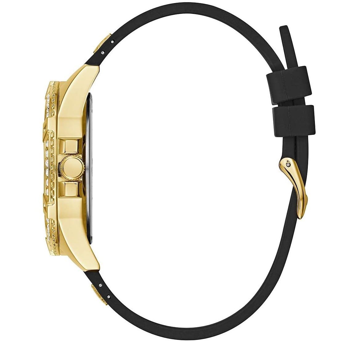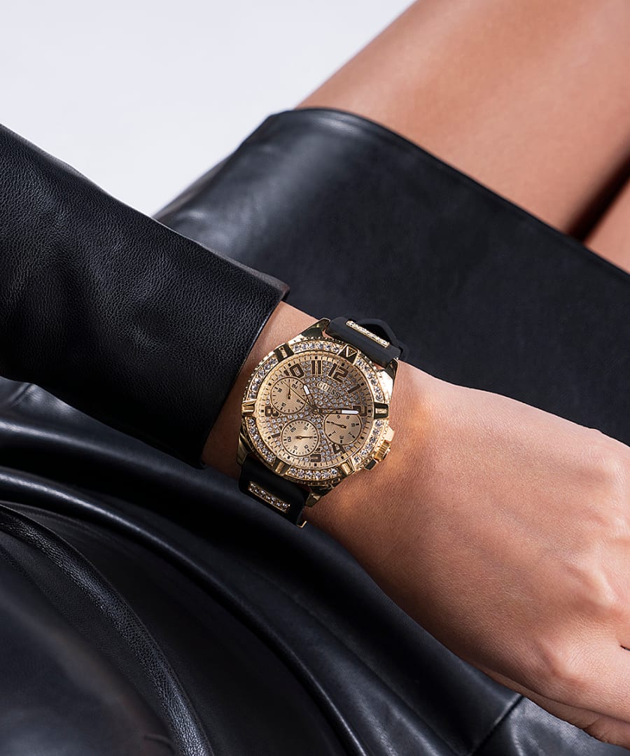 Expertly crafted by the renowned brand Guess, this women's watch features a sleek black dial and a frame of sparkling stones, adding a touch of glamour to any outfit. The perfect blend of style and functionality, this timepiece is a must-have accessory for any fashion-forward individual.