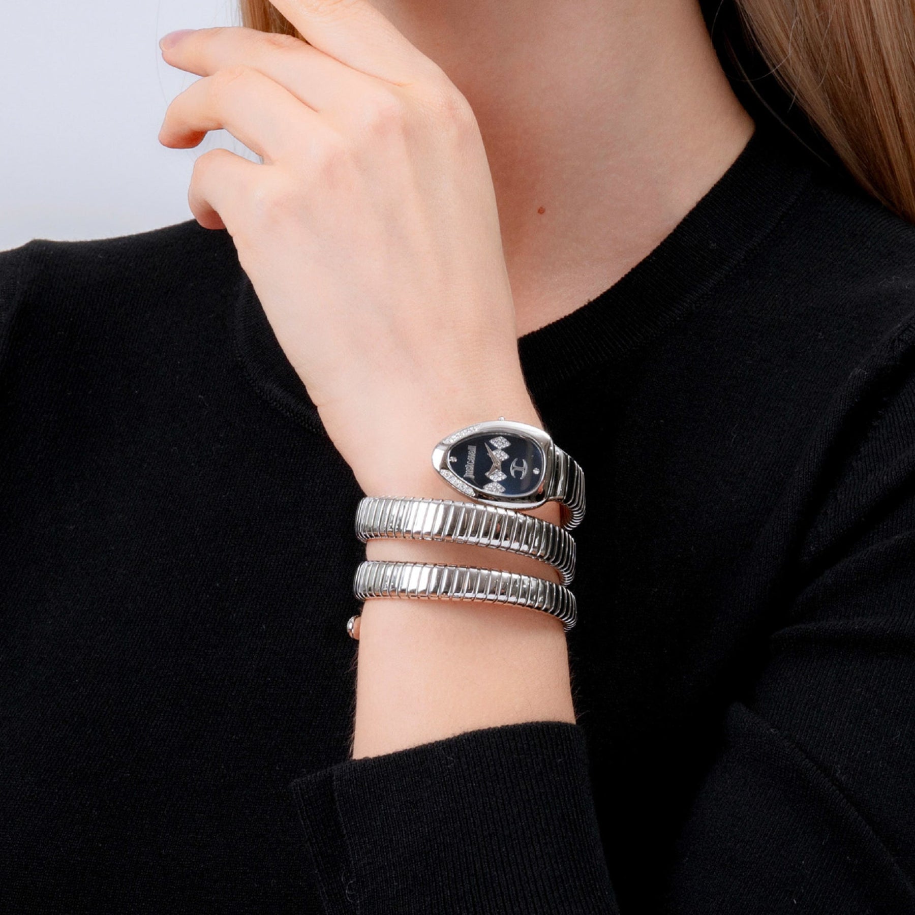 The Just Cavalli JC1L230M0025 is a striking timepiece from the Signature Snake collection, designed for women who appreciate bold elegance. Featuring a blue dial and a stainless steel bracelet that coils around the wrist like a snake, this watch combines fashion-forward design with reliable craftsmanship.